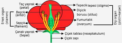 Şekil: Tam çiçeğin kısımları Çiçek tablası: Çiçeğin üreme organlarını taşır. Üremeye doğrudan katılmaz. Çanak yaprak (sepal): Çiçeğin en dışında yer alan, çoğunlukla yeşil renkte olan ve tomurcuk halindeyken iç kısımdaki organları korumakla görevli kısım olup, bazı bitkilerde fotosentez yapabilir. Üremede görevi yoktur. Taç yaprak (petal): Genellikle renkli ve kokulu tek ya da birkaç sıralı yapraklardır. Böcekleri ve diğer tozlaştırıcıları kendine çekerek tozlaşmaya yardımcı olur. Ayrıca iç kısımlardaki yapıları da korur. Erkek organ (stamen): Sapçık (flament) başçık (anter) olmak üzere iki kısımdan oluşur. Başçık polenlerin oluştuğu kısımdır. Polen keseleri burada bulunur. Başçığın kesiti alındığında teka denilen dört bölmeli bir yapı göze çarpar. Bölmelerin her birinde polen keseleri bulunur. Polen keseleri polenleri üretir. |