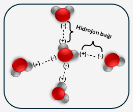 arasındaki hidrojen bağları. Her su molekülü maksimum dört adet komşu su
