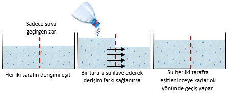 difüzyonudur. Suyun, yarı geçirgen bir zar üzerinden çok olduğu ortamdan, az