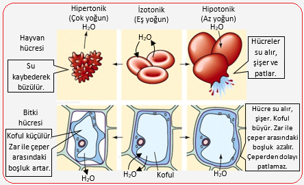 c) Hipotonik (az yoğun) ortam: Hücreye göre maddenin az, suyun çok olduğu ortamdır.