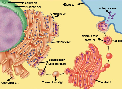 ER üzerindeki ribozomlarda sentezlenir. Golgide işlenir paketlenir. Hücre