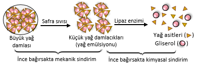 sindirimi incebağırsakta başlar ve burada tamamlanır. Midede yağ sindirimi