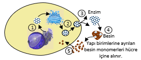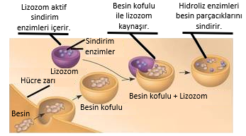 lizozom birleşir. Lizozomdaki enzimler, besinleri yapı taşlarına