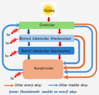 tüketicilere ve ayrıştırıcılara doğru hem madde akışı hem de enerji akışı