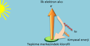 - Bir foton (Işığın yapısında yüksek hızla hareket eden ve enerji yüklü olan tanecikler), bir pigment molekülüne çarptığında enerji tepkime merkezine ulaşıncaya kadar bir molekülden diğerine geçer. Tepkime merkezindeki klorofilden ayrılan uyarılmış bir elektron, özelleşmiş bir molekül tarafından yakalanır. Bu molekül ilk elektron alıcısı olarak isimlendirilir. -Elektron aktarımı enerji dönüşümlerinin başlangıcıdır.  Şekil: Işığın bir fotosistem tarafından toplanması  Şekil: Işığın klorofil molekülüne çarpmasıyla oluşan elektron kopması ve enerji dönüşümü |
